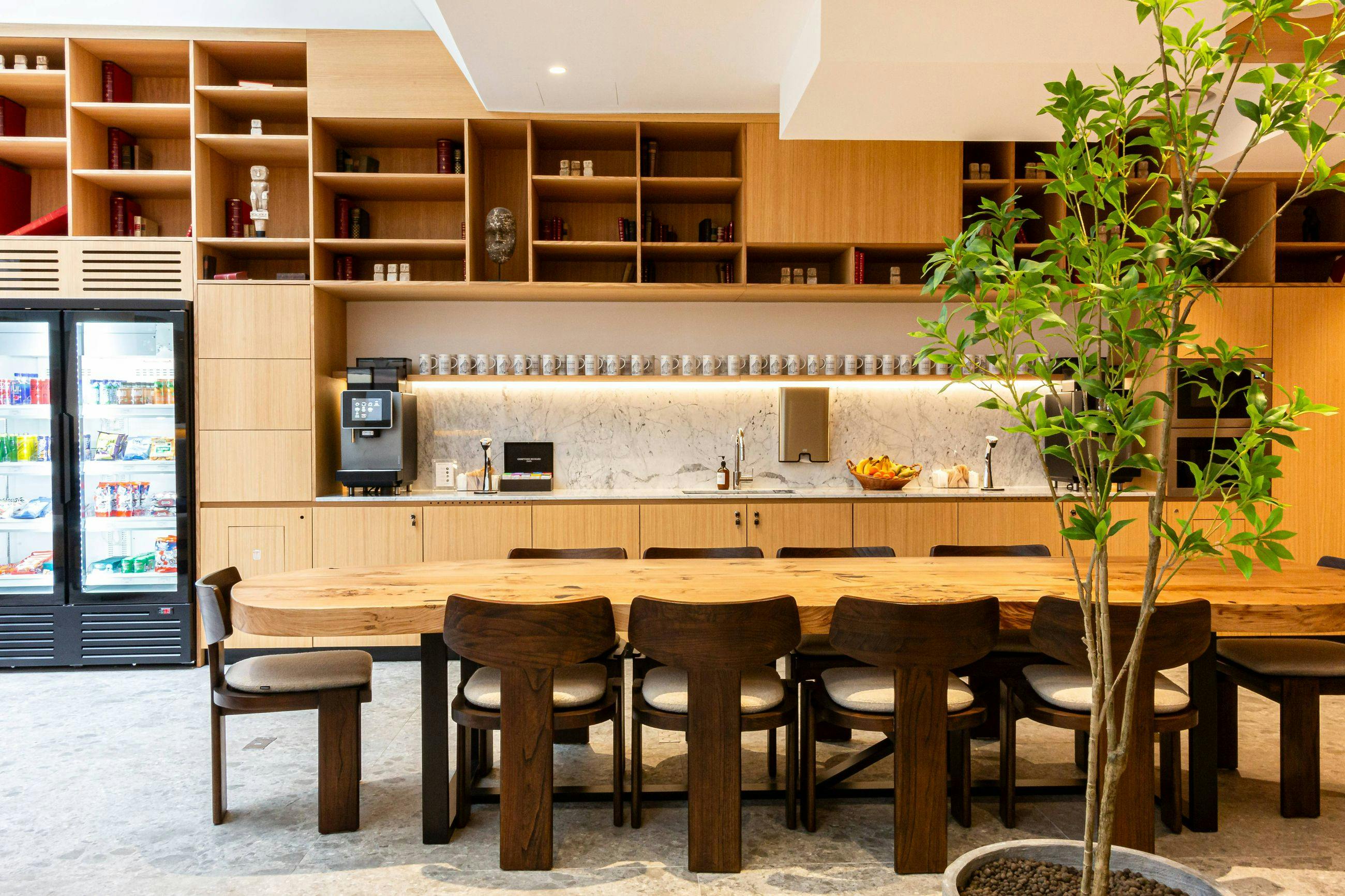 Des cuisines équipées (café, thé, eau filtrée, réfrigérateur, four micro-ondes, lave-vaisselle etc.) sont mises à disposition à tous les étages ainsi qu'au rez-de-chaussée où le grand espace de vie sous l'atrium est un lieu idéal pour vos déjeuners entre collaborateurs ou pour un échange autour d'un café.
